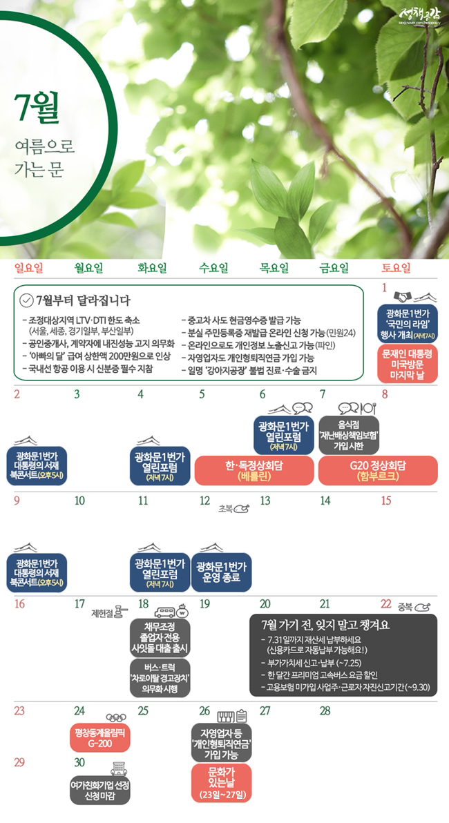 7월부터 달라집니다. 조정대상지역 LTV·DTI한도 축소(서울, 세종, 경기일부, 부산일부), 공인중개사, 계약자에 내진성능 고지 의무화, '아빠의 달'급여 상한액 200만원으로 인상, 국내선 항공 이용시 신분증 필수 지참, 중고차 사도 현금영수증 발급 가능, 분실 주민등록증 재발급 온라인 신청 가능(민원24), 온라인으로도 개인정보 노출신고 가능, 자영업자도 개인형퇴직연금 가입 가능, 일명 '강아지공장' 불법 진료·수술 금지. 7월 가기 전, 잊지말고 챙겨요. 7월 31일까지 재산세 납부하세요(신용카드로 자동납부 가능해요), 부가가치세 신고·납부(7월 25일까지), 한 달간 프리미엄 고속버스 요금 할인, 고용보험 미가입 사업주·근로자 자진신고기간(9월 30일까지). 7월 주요 일정입니다. 7월 1일(토요일) 광화문 1번가에서 '국민의 라임' 행사 개최합니다. 문재인 대통령 미국방문 마지막 날입니다. 7월 2일(일요일) 광화문 1번가에서 대통령의 서재 북콘서트 개최합니다. 7월 4일(화요일) 광화문 1번가에서 열린포럼이 열립니다. 7월 5일(수요일)에서 6일(목요일)까지 한국·독일 정상회담을 갖습니다. 7월 6일(목요일) 광화문 1번가에서 열림포럼이 7시에 열립니다. 7월 7일(금요일)에서 8일(토요일)까지 G20 정상회담이 독일 함부르크에서 개최됩니다. 7월 7일(금요일) 음식점은 '재난배상책임보험'에 7월 7일 안으로 반드시 가입해야 합니다. 7월 9일(일) 광화문 1번가에서 대통령의 서재 북콘서트가 열립니다. 7월 11일(화요일) 광화문 1번가에서 열림포럼이 저녁 7시에 열립니다. 7월 12일(수요일) 광화문 1번가 운영이 종료됩니다. 7월 18일(화요일) 채무조정 졸업자 전용 사잇돌 대출이 출시됩니다. 버스·트럭 '차로이탈 경고장치' 장착이 의무화 시행됩니다. 7월 24일(월요일) 평창동계올림픽 G-200을 기념한 다양한 행사가 열립니다. 7월 26일(수요일) 자영업자 등 '개인형 퇴직연급'에 가입할 수 있는 대상자가 확대됩니다. 매월 마지막주 수요일은 문화가 있는 날이므로 공연·전시·스포츠·문화재 등 다양한 할인 혜택을 누려보세요. 문화가 있는 날이 7월부터는 주간으로 확대 시행됩니다.(23일부터 27일까지) 7월 30일(월요일)은 여가친화기업 선정 신청 마감일입니다. 문화체육관광부 정보제공처 : 문화체육관광부
