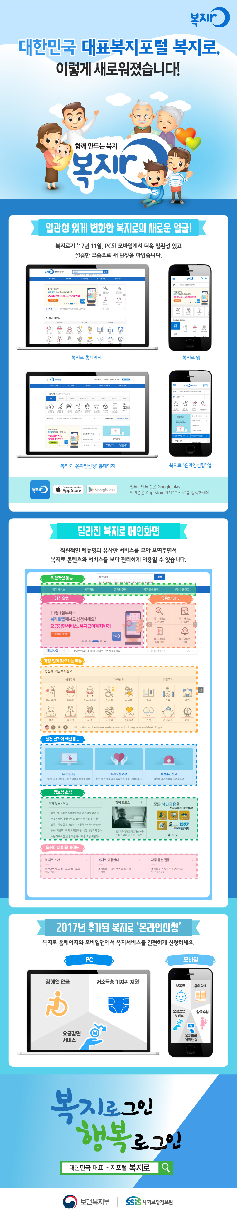 대한민국 대표복지포털 복지로, 이렇게 새로워졌습니다! 함께 만드는 복지 복지로. 일관성 있게 변화한 복지로의 새로운 얼굴! 복지로가 '17년 11월, PC와 모바일에서 더욱 일관성 있고 깔끔한 모습으로 새 단장을 하였습니다. 복지로 홈페이지 복지로 앱 복지로 '온라인신청' 홈페이지 복지로 '온라인신청' 앱 안드로이드 폰은 Google play, 아이폰은 App Store에서 '복지로'를 검색하세요. 달라진 복지로 메인화면 직관적인 메뉴명과 유사한 서비스를 모아 보여주면서 복지로 콘텐츠와 서비스를 보다 편리하게 이용할 수 있습니다. 통합검색, 직관적인 메뉴 : 복지서비스, 복지정보, 온라인신청, 복지도움요청, 부정수급신고 이슈 알림 : 11월 1일부터~ 복지로앱에서도 신청하세요! 요금감면서비스, 복지급여계좌변경 자세히보기, 유용한 메뉴 : 복지서비스 간편검색, 복지서비스 상세검색, 복지서비스 모의계산, 복지알림이 신청, 가장 많이 찾으시는 메뉴 : 한눈에 보는 복지정보 생애주기(임신·출산, 영유아, 아동·청소년, 청년, 중장년, 노년), 가구상황(장애인, 한부모, 다문화, 저소득층), 관심주제(교육, 고용, 주거, 건강, 서민금융, 문화), 신청 성격의 핵심 메뉴 : 온라인신청(이제, 온라인신청으로 편리하게 이용하세요). 복지도움요청(본인 또는 이웃에게 필요한 도움을 요청하세요. 부정수급신고(국민의 복지재정을 지켜주세요). 정보성 소식 : 복지뉴스·이슈, 함께 도와요(8살 지원이가 크리스마스 선물로 받고 싶은 것 지환(가명)이. 알림존(모든 서민금융을 한자리에서 간편하게! 국번없이 1397 서민금융진흥원). 홈페이지 이용 가이드 : 복지로 소개(대한민국 대표 복지포털 복지로를 만나보세요), 복지로 이용안내(복지로의 다양한 메뉴를 소개해드려요, 자주 묻는 질문(복지로를 이용하는데 어려움이 있으신가요?). 2017년 추가된 복지로 '온라인신청' 복지로 홈페이지와 모바일앱에서 복지서비스를 간편하게 신청하세요. PC : 장애인 연금, 저소득층 기저귀 지원, 요금감면 서비스. 모바일 : 보육료, 유아학비, 양육수당, 복지급여 계좌변경, 요금감면 서비스. 복지로그인 행복로그인 대한민국 대표 복지포털 복지로 보건복지부 사회보장정보원