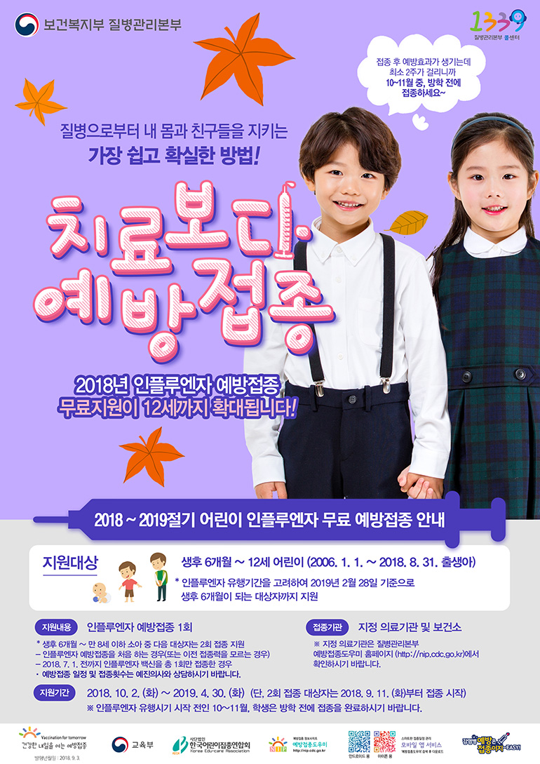 2018년 인플루엔자 예방접종 무료지원이 12세까지 확대됩니다!