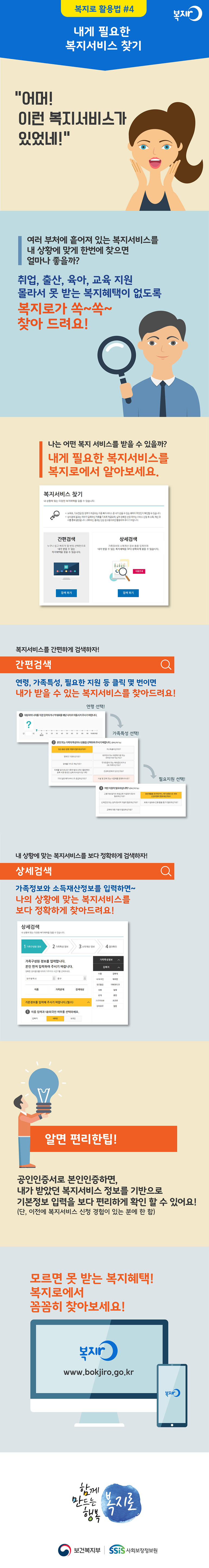복지로 활용법#4 내게 필요한 복지서비스 찾기 "어머! 이런 복지서비스가 있었네!" 여러 부처에 흩어져 있는 복지서비스를 내 상화에 맞게 한번에 찾으면 얼마나 좋을까? 취업, 출산, 육아, 교육 지원 몰라서 못받는 복지혜택이 없도록 복지로가 쏙~ 쏙~ 찾아 드려요! 나는 어떤 복지서비스를 받을 수 있을까? 내게 필요한 복지서비스를 복지로에서 알아보세요. 복지서비스를 간편하게 검색하자! 간편검색 연령, 가족특성, 필요한 지원 등 클릭 몇 번이면 내가 받을 수 있는 복지서비스를 찾아 드려요! 연령선택! → 가족특성 선택! → 필요지원 선택! 내상황에 맞는 복지서비스를 보다 정확하게 검색하자! 상세검색 가족정보와 소득재산정보를 입력하면~ 나의 상황에 맞는 복지서비스를 보다 정확하게 찾아드려요! 알면 편리한 팁! 공인인증서로 본인인증하면, 내가 받았던 복지서비스 정보를 기반으로 기본정보 입력을 보다 편리하게 확인 할 수 있 어요!(단, 이전에 복지서비스 신청 경험이 있는 분에 한함) 모르면 못 바ㄸ는 복지혜택! 복지로에서 꼼꼼히 찾아보세요. 함께 만드는 행복 복지로 (보건복지부, 사회보장정보원)