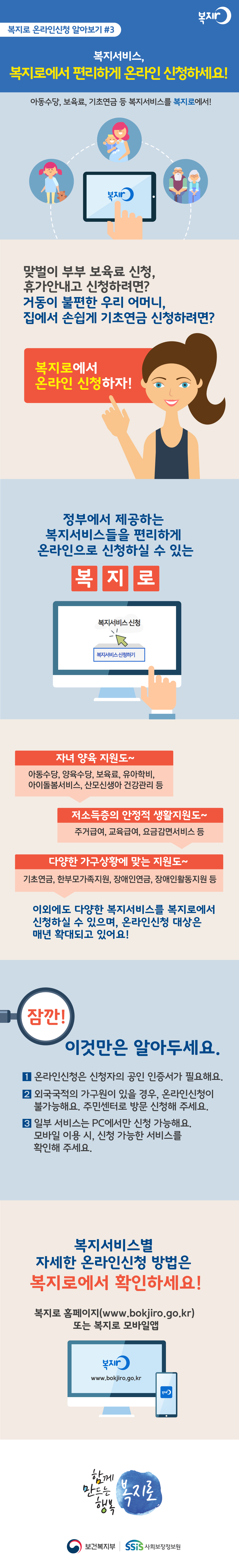 복지로 온라인신청 알아보기#3 복지서비스, 복지로에서 편리하게 온라인 신청하세요! 아동수당, 보육료, 기초연금 등 복지서비스를 복지로에서! 맞벌이 부부 보육료 신청, 휴가안내고 신청하려면? 거동이 불편한 우리 어머니, 집에서 손쉽게 기초연금 신청하려면? 복지로에서 온라인 신청하자! 정부에서 제공하는 복지서비스들을 편리하게 온라인으로 신청하실 수 있는 복지로 자녀 양육 지원도~ 아동수당, 양육수당, 보육료, 유아학비, 아이돌봄서비스, 산모신생아 건강관리 등 저소득층의 안정적 생활지원도~ 주거급여, 교육급여, 요금감면서비스 등 다양한 가구상황에 맞는 지원도~ 기초연금, 한부모가족지원, 장애인연금, 장애인활동지원 등 이외에도 다양한 복지서비스를 복지로에서 신청하실 수 있으며, 온라인신청 대상은 매년 확대되고 있어요! 잠깐! 이것만은 알아두세요. 1.온라인신청은 신청자의 공인 인증서가 필요해요. 2.외국국적의 가구원이 있을 경우, 온라인신청이 불가능해요. 주민센터로 방문 신청해 주세요. 3.일부 서비스는 PC에서만 신청 가능해요. 모바일 이용 시, 신청 가능한 서비스를 확인해 주세요. 복지서비스별 자세한 온라인신청 방법은 복지로 홈페이지(www.bokjiro.go.kr)또는 복지로 모바일앱 함께만드는 행복 복지로 보건복지부 사회보장정보원