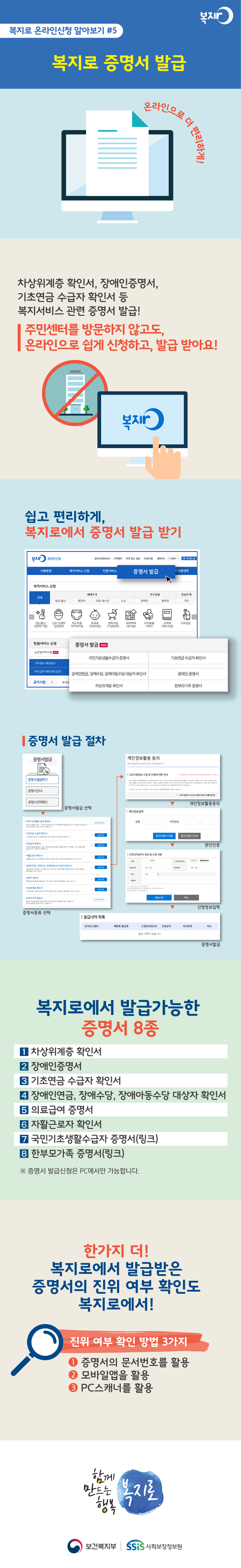 복지로 온라인신청 알아보기 #5 복지로 증명서 발급 온라인으로 더 편리하게! 차상위계층 확인서, 장애인증명서, 기초연금 수급자 확인서 등 복지서비스 관련 증명서 발급! 주민센터를 방문하지 않고도, 온라인으로 쉽게 신청하고, 발급 받아요! 쉽고 편리하게, 복지로에서 증명서 발급 받기 증명서 발급 절차 증명서발급 선택 → 증명서종류 선택 → 개인정보활용동의 → 본인인증 → 신청정보입력 → 증명서발급 복지로에서 발급가능한 증명서 8종 1.차상위계층 확인서 2.장애인증명서 3.기초연금 수급자 확인서 4.장애인연금, 장애수당, 장애아동수당 대상자 확인서 5.의료급여 증명서 6.자활근로자 확인서 7.국민기초생활수급자 증명서(링크) 8.한부모가족 증명서(링크) ※증명서 발급신청은 PC에서만 가능합니다. 한가지 더! 복지로에서 발급받은 증명서의 진위 여부 확인도 복지로에서! 진위 여부 확인 방법 3가지 ①증명서의 문서번호를 활용 ②모바일앱을 활용 ③PC스캐너를 활용 함께 만드는 행복 복지로 보건복지부 사회보장정보원