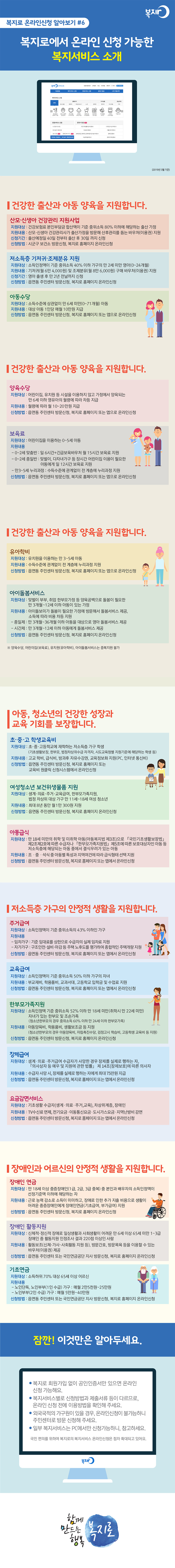복지로 온라인신청 알아보기 #6 복지로에서 온라인 신청 가능한 복지서비스 소개 건강한 출산과 아동 양육을 지원합니다. 산모·신생아 건강관리 지원사업 지원대상: 건강보험료 본인부담금 합산액이 기준 중위소득 80% 이하에 해당하는 출산 가정 지원내용: 산모·신생아 건강관리사가 출산가정을 방문해 산후관리를 돕는 바우처(이용권) 지원 신청기간: 출산예정일 40일 전부터 출산 후 30일까지 신청 신청방법: 시군구 보건소 방문신청, 복지로 홈페이지 온라인신청 저소득층 기저귀·조제분유 지원 지원대상: 소득인정액이 기준 중위소득 40%이하 가구의 만2세 미만 영아(0~24개월) 지원내용 : 기저귀(월 6만 4,000원) 및 조제분유(월 8만 6,000원) 구매 바우처(이용권) 지원 신청기간: 영아 출생 후 만 2년 전날까지 신청 신청방법: 읍면동 주민센터 방문신청, 복지로 홈페이지 온라인신청 아동수당 지원대상: 소득수준에 상관없이 만6세 미만(0~71개월) 아동 지원내용: 대상 아동 1인당 매월 10만원 지급 신청방법: 읍면동 주민센터 방문신청, 복지로 홈페이지 온라인신청 아동수당 지원대상: 소득수준에 상관없이 만6세 미만(0~71개월) 아동 지원내용: 대상 아동 1인당 매월 10만원 지급 신청방법: 읍면동 주민센터 방문신청, 복지로 홈페이지 또는 앱으로 온라인신청 양육수당 지원대상: 어린이집, 유치원 등 시설을 이용하지 않고 가정에서 양육되는 만6세 이하 영유아의 월령에 따라 차등 지급 지원내용: 월령에 따라 월10~20만원 지급 신청방법: 읍면동 주민센터 방문신청, 복지로 홈페이지 또는 앱으로 온라인신청 ㅣ로 보육료 지원대상: 어린이집을 이용하는 0~5세 아동 지원내용 - 0~2세 맞춤반 : 일6시간+긴급보육바우처 월 15시간 보육료 지원 - 0~2세 종일반 : 맞벌이, 다자녀가구 등 장시간 어린이집 이용이 필요한 아동에게 일 12시간 보육료 지원 - 만3~5세 누리과정 : 소득수준에 관계없이 전계층에 누리과정 지원 신청방법: 읍면동 주민센터 방문신청, 복지로 홈페이지 또는 앱으로 온라인신청 유아학비 지원대상: 유치원을 이용하는 만3~5세 아동 지원내용: 소득수준에 관계없이 전 계층에 누리과정 지원 신청방법: 읍면동 주민센터 방문신청, 복지로 홈페이지 또는 앱으로 온라인신청 아이돌봄서비스 지원대상: 맞벌이 부부, 취업 한부모가정 등 양육공백으로 돌봄이 필요한 만 3개월~12세 이하 아동이 있는 가정 지원내용 : 아이돌보미가 돌봄이 필요한 가정에 방문해서 돌봄서비스 제공, 소득에 따라 비용 차등 지원 -종일제 : 만3개월~36개월 이하 아동을 대상으로 영아 돌봄서비스 제공 -시간제: 만3개월~12세 이하 아동에게 돌봄서비스 제공 신청방법: 읍면동 주민센터 방문신청, 복지로 홈페이지 온라인신청 ※양육수 당, 어린이집(보육료), 유치원(유아학비), 아이돌봄서비스는 중복지원 불가 아동, 청소년의 건강한 성장과 교육 기회를 보장합니다. 초·중·고 학생교육비 지원대상: 초·중·고등학교에 재학하는 저소득층 가구 학생(기초생활보장, 한부모, 법정차상위수급 자격자, 시도교육청별 지원기준에 해당하는 학생 등) 지원내용: 고교 학비, 급식비, 방과후 자유수강권, 교육정보화 지원(PC, 인터넷 통신비) 신청방법: 읍면동 주민센터 방문신청, 복지로 홈페이지 또는 교육비 원클릭 신청시스템에서 온라인신청 여성청소년 보건위생물품 지원 지원대상: 생계·의료·주거·교육급여, 한부모가족지원, 법정 차상위 대상 가구 만11세~18세 여청 청소년 지원내용: 최대 8년 동안 월1만 300원 지원 신청방법: 읍면동 주민센터 방문신청, 복지로 홈페이지 온라인신청 아동급식 지원대상 : 만 18세 미만의 취학 및 미취학 아동(아동복지법 제3조)으로 「국민기초생활보장법」제2조제2호에 따른 수급자나 「한부모가족지원법」 제5조에 따른 보호대상자인 아동 등 저소득층에 해당되는 아동 중에서 결식우려가 있는 아동 지원내용: 조·중·석식 중 아동별 특성과 지역여건에 따라 급식형태 선택 지원 신청방법 : 읍면동 주민센터 방문신청, 복지로 홈페이지 또는 앱에서 온라인신청 저소득층 가구의 안정적 생활을 지원합니다. 주거급여 지원대상: 소득인정액이 기준 중위소득의 43% 이하인 가구 지원내용 -임차가구 : 기준 임대료를 상한으로 수급자의 실제 임차료 지원 -자가가구 : 구조안전·설비·마감 등 주택 노후도를 평가하여 종합적인 주택개량 지원 신청방법: 읍면동 주민센터 방문신청, 복지로 홈페이지 또는 앱에서 온라인신청 교육급여 지원대상: 소득인정액이 기준 중위소득 50% 이하 가구의 자녀 지원내용: 부교재비, 학용품비, 교과서대, 고등학교 입학금 및 수업료 지원 신청방법: 읍면동 주민센터 방문신청, 복지로 홈페이지 또는 앱에서 온라인신청 한부모가족지원 지원대상: 소득인정액 기준 중위소득 52% 이하 만 18세 미만(취학시 만22세 미만) 자녀가 있는 한부모 및 조손가족(청소년한부모의 경우 중위소득 60% 이하 만 24세 이하 한부모가족) 지원내용: 아동양육비, 학용품비, 생활보조금 등 지원(청소년한부모의 경우 아동양육비, 자립촉진수당, 검정고시 학습비, 고등학생 교육비 등 지원) 신청방법: 읍면동 주민센터 방문